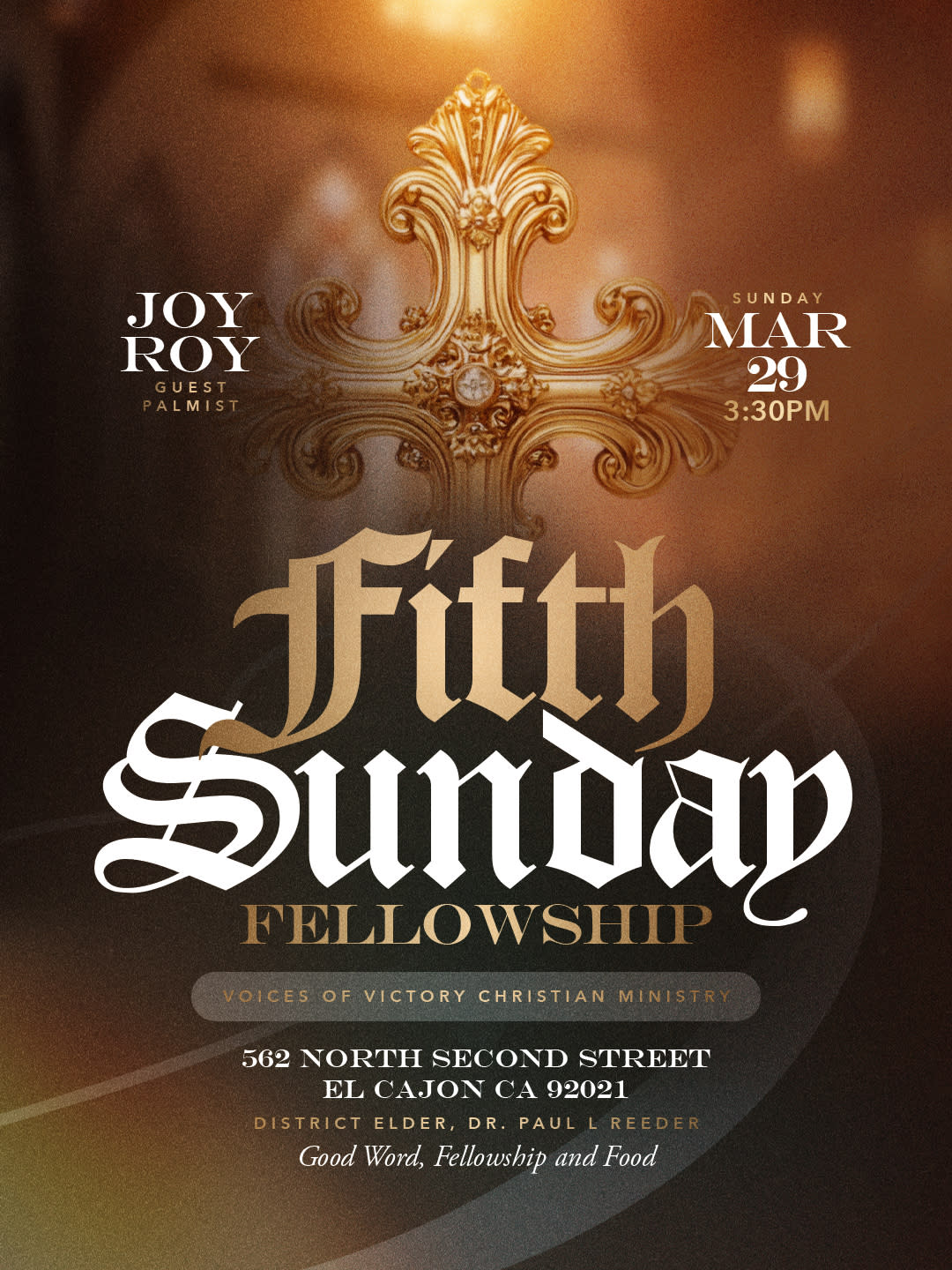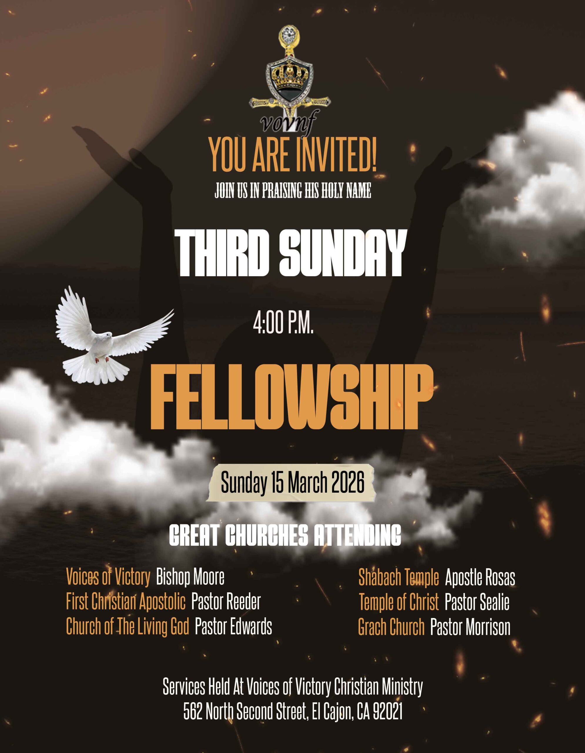March 15 – El Cajon, CA – 3rd Sunday Fellowship Service. Held at Voices of Victory Christian Ministry. Start Time @ 4:00 p.m.